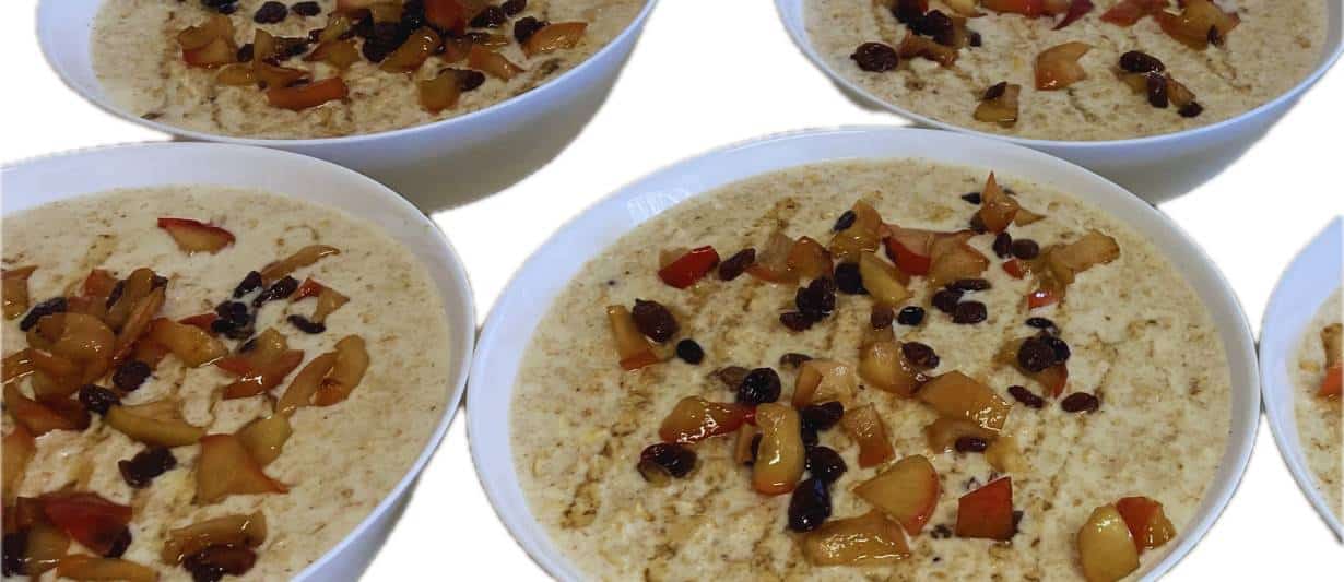 - Pour the oats in a mixing bowl and add the caramalised apples and sultanas on top. Drizzle with honey and it’s ready to eat.