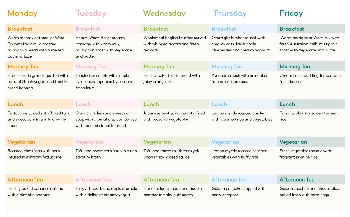 Here’s an example of what a weekly menu might look like at our centres, giving you a taste of the variety, balance, and creativity that go into every dish: