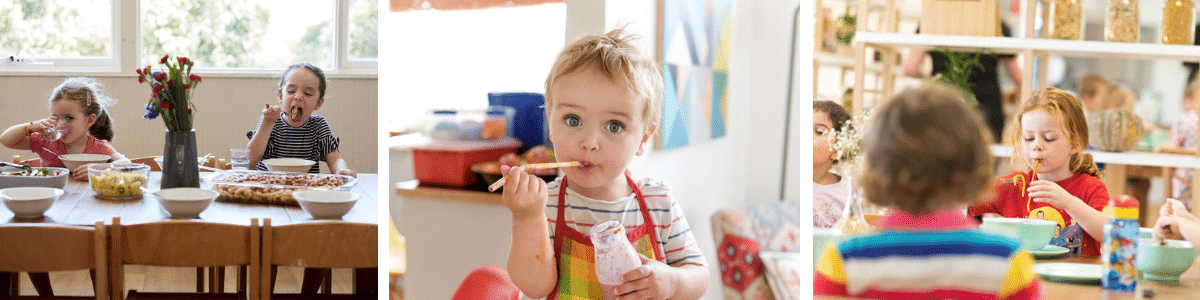 - Role-modelling healthy habits: Educators sit and eat alongside children, demonstrating positive food choices and engaging in informal, age-appropriate conversations about what’s on the plate.