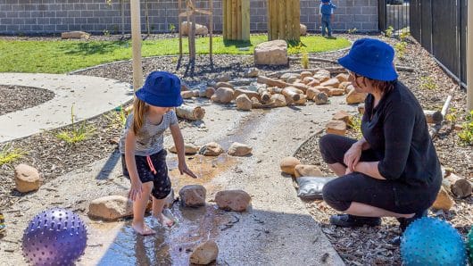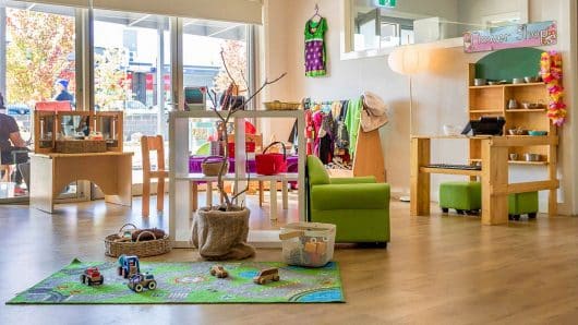 The light-filled and spacious centre also has pet guinea pigs, chickens, a vegetable garden, a worm farm, water play, stay and play pods, an Indigenous mural, and a range of age-specific ateliers.