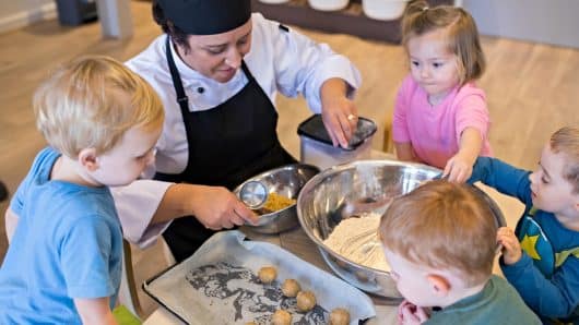 Our on-site chefs prepare five nutritionally balanced meals using seasonal ingredients every day. The open kitchen allows children to interact and watch the chefs cook all meals, which enhances their understanding of good nutrition.